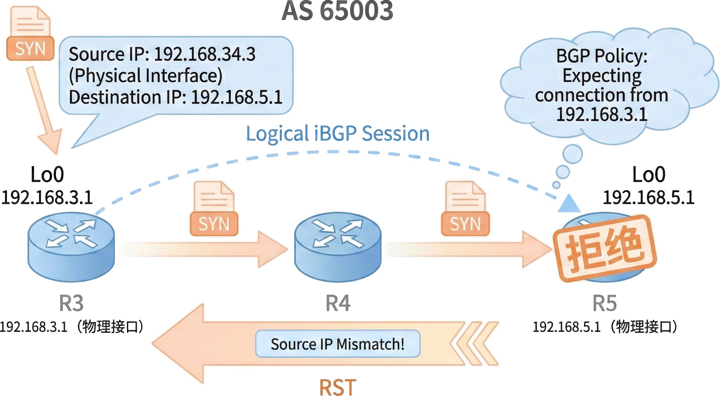 然而,在默认情况下,Cisco路由器在发起TCP连接(或发送任何数据包)时,会遵循标准的IP路由规则,即数据包从哪个接口发出,就使用该接口的IP地址作为源IP;在本实验中,R3去往R5的Loopback口(5.5.5.5)时,根据OSPF计算的路由,数据包必须从R3的物理接口f0/0发出,因此TCP SYN包的源IP就是物理接口地址 192.168.34.3;当这个数据包到达R5时,R5查阅自己的BGP配置表,发现自己等待的是来自 3.3.3.3 的连接,而眼前这个 192.168.34.3 是个陌生人,于是R5会毫不留情地发送TCP RST(重置)报文拒绝连接,这就是你明明Ping通了却建不起邻居的原因,必须通过 update-source 命令强制修改TCP握手的源地址才能解决