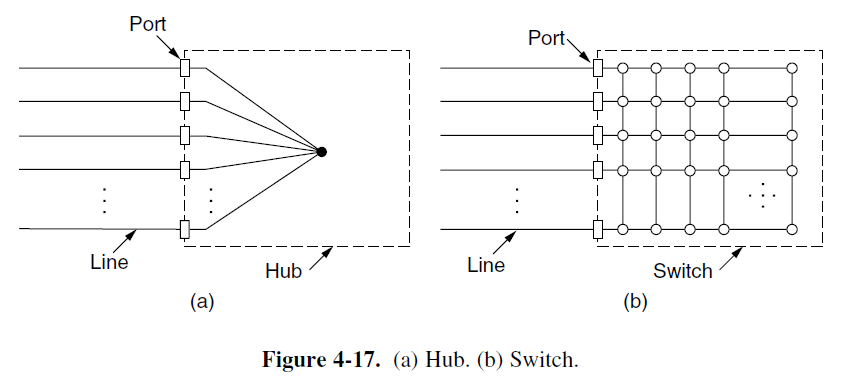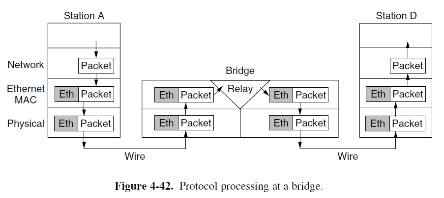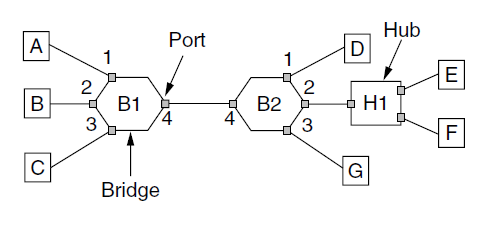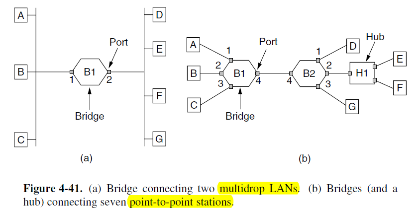 - Bridge: unlike in a hub, each port is isolated to be its own collision domain; if the port has a full-duplex point-to-point line, the CSMA/CD algorithm is not needed.