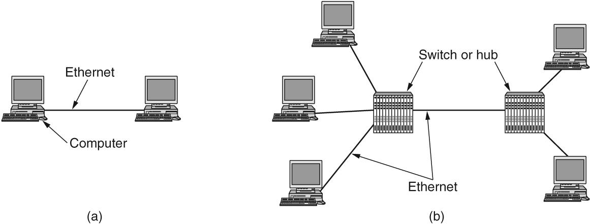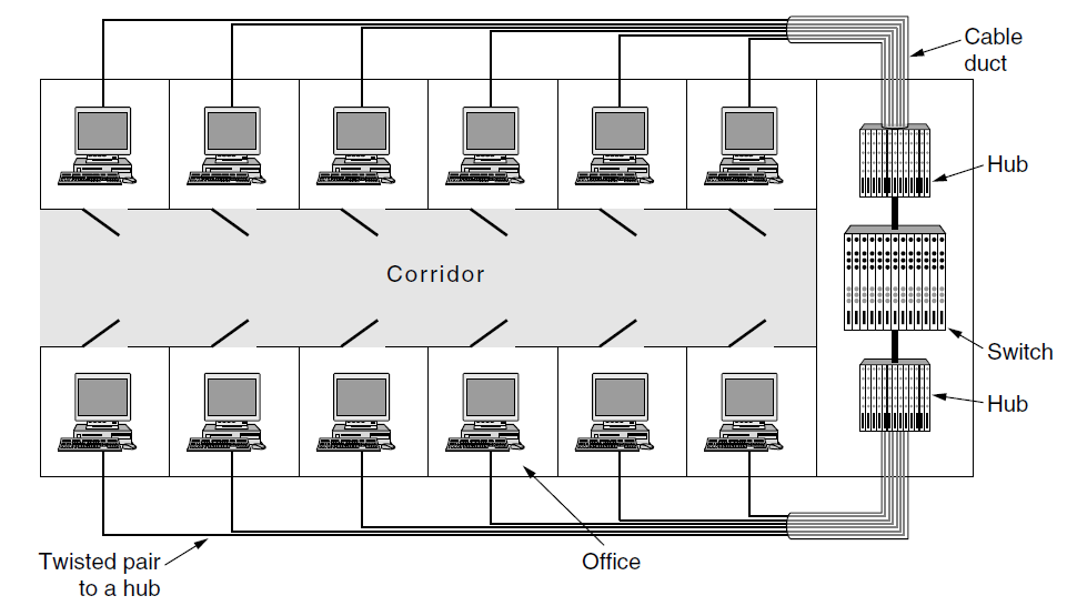 - (I) A building with centralized wiring using hubs and a switch: