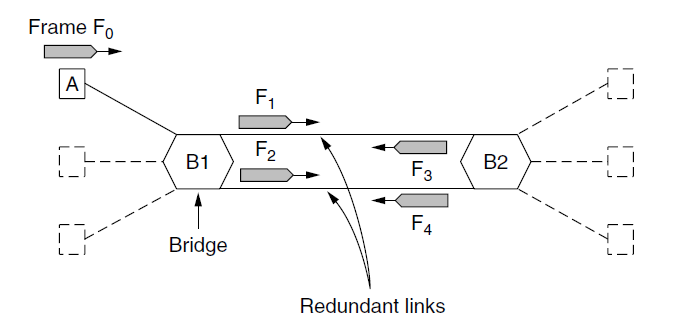 - For example: initially D want to send a frame to F (because F is previously unobserved by D, so each switch flooding the frame to the ports it connected except the incoming one. The red arrows denote the flooding process)