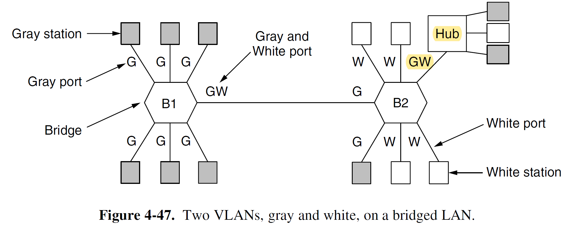 - When a frame comes in from, say, the gray VLAN, it must be forwarded on all the ports marked with a G.