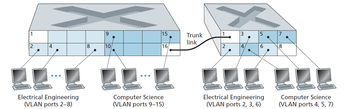 - VLAN trunking: a special port on each switch is configured as a trunk port to interconnect the two VLAN switches.